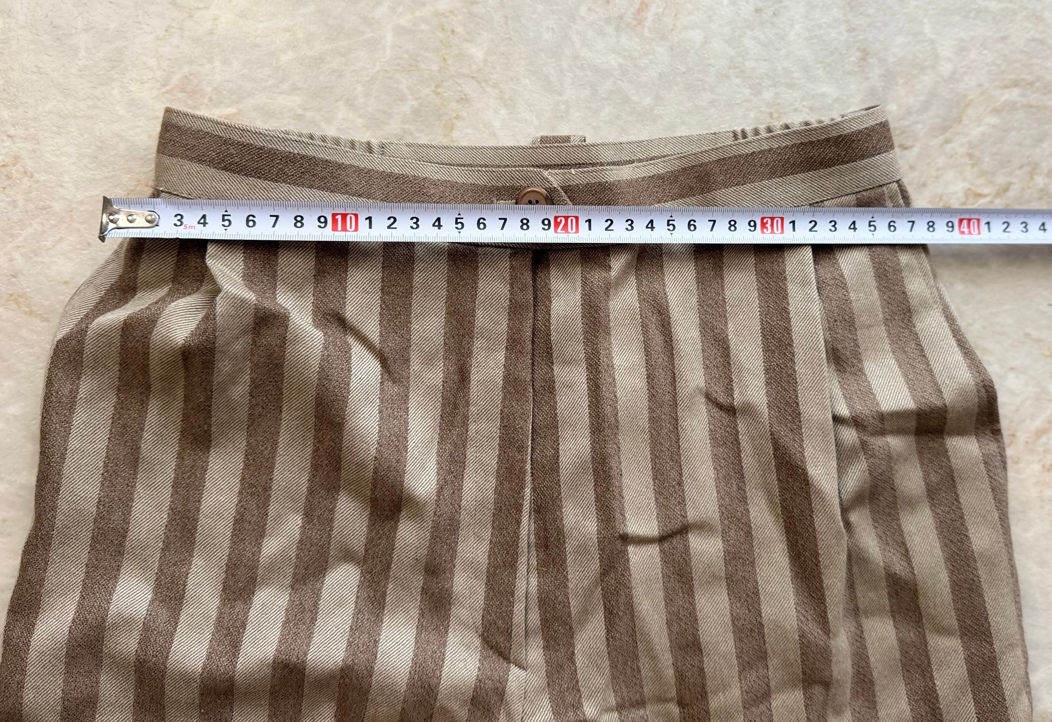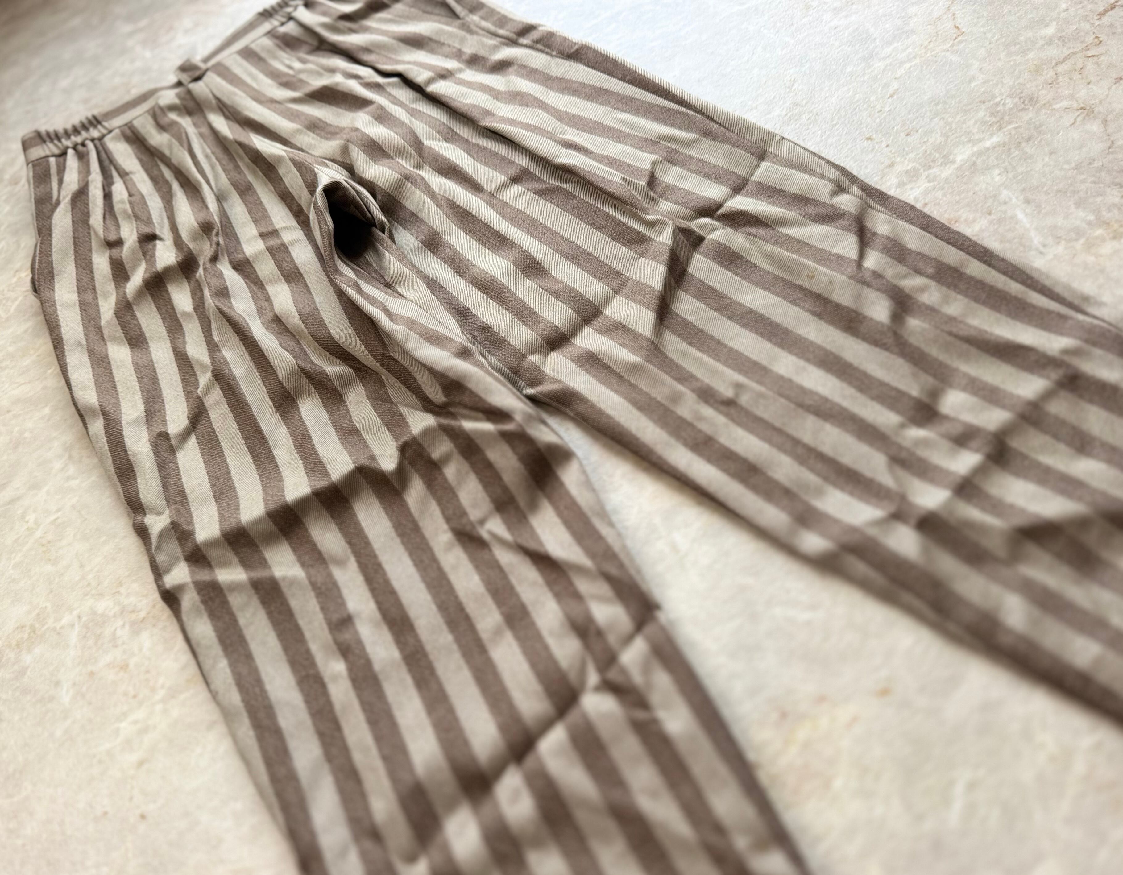 ブラウン系のストライプ柄が特徴的なカジュアルパンツ。