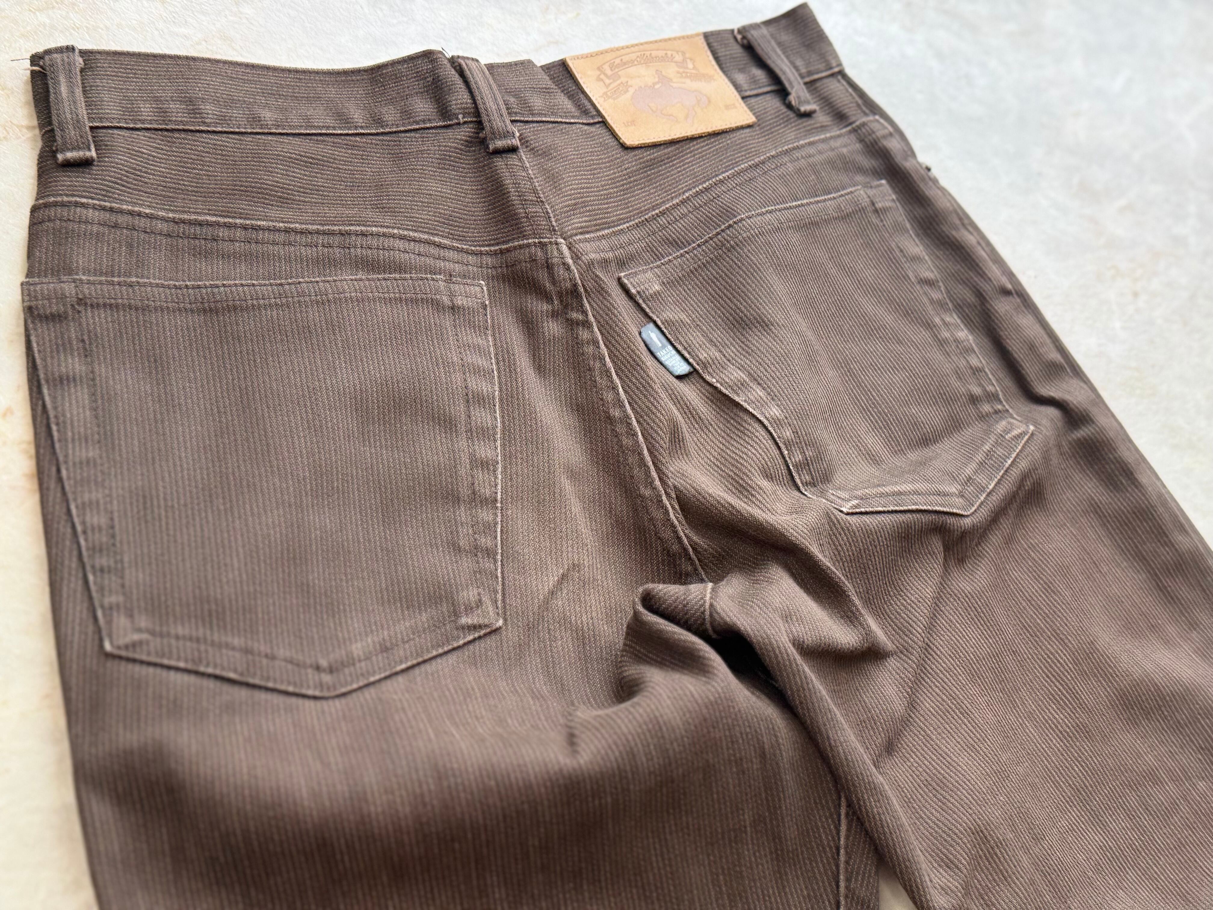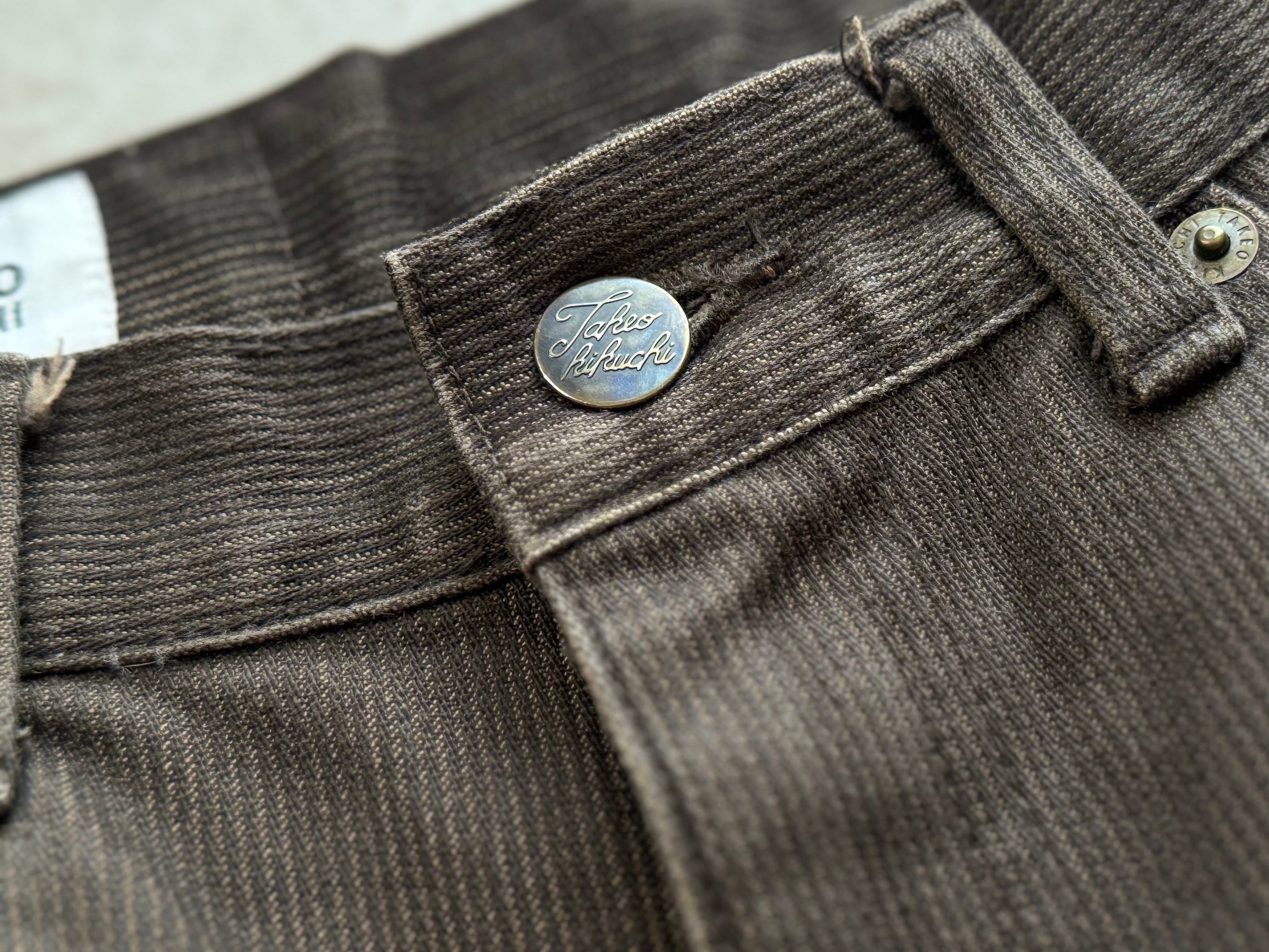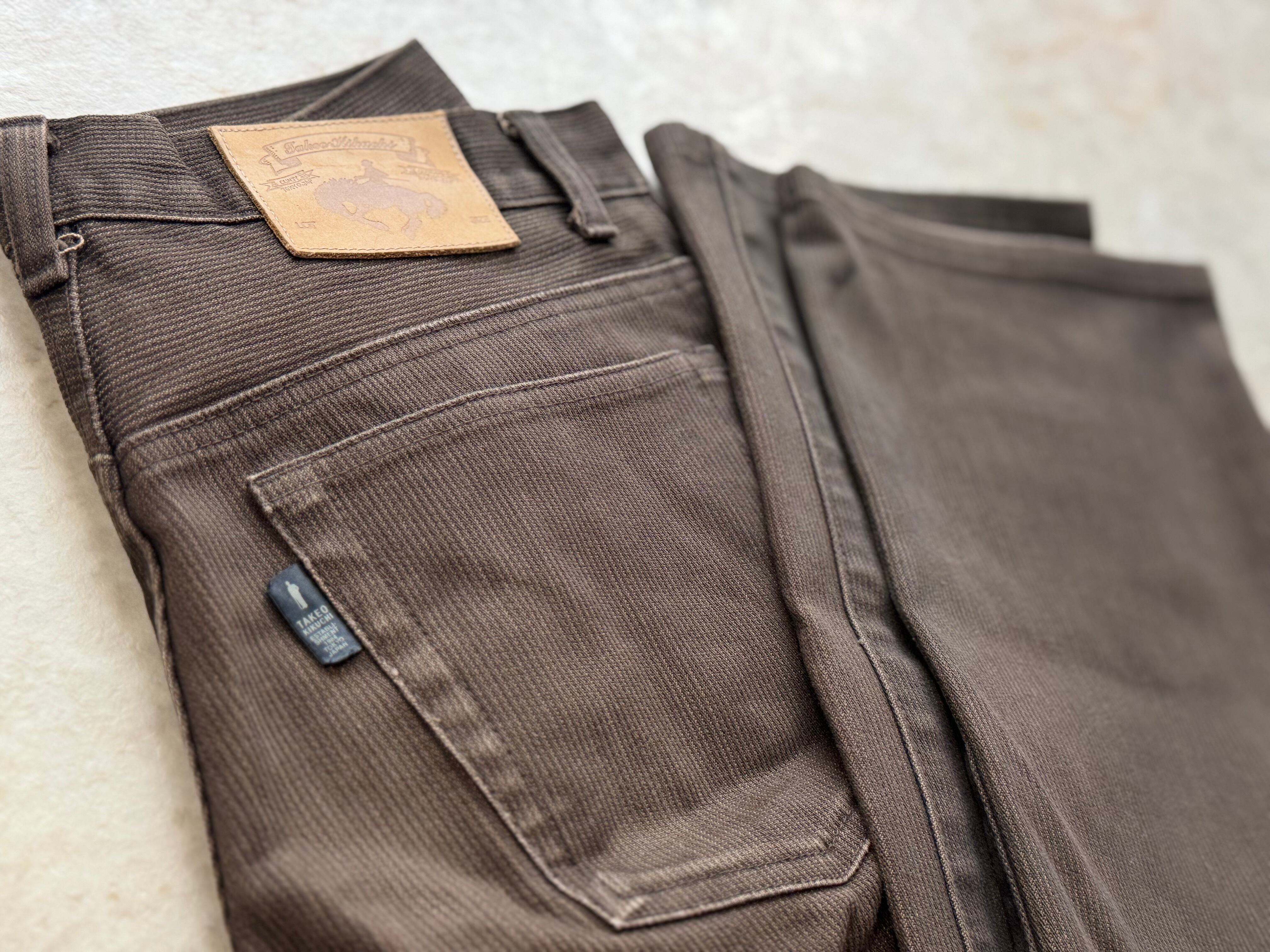 ブラウンのストレートレッグデニム、バックポケット付きのシンプルなデザイン。