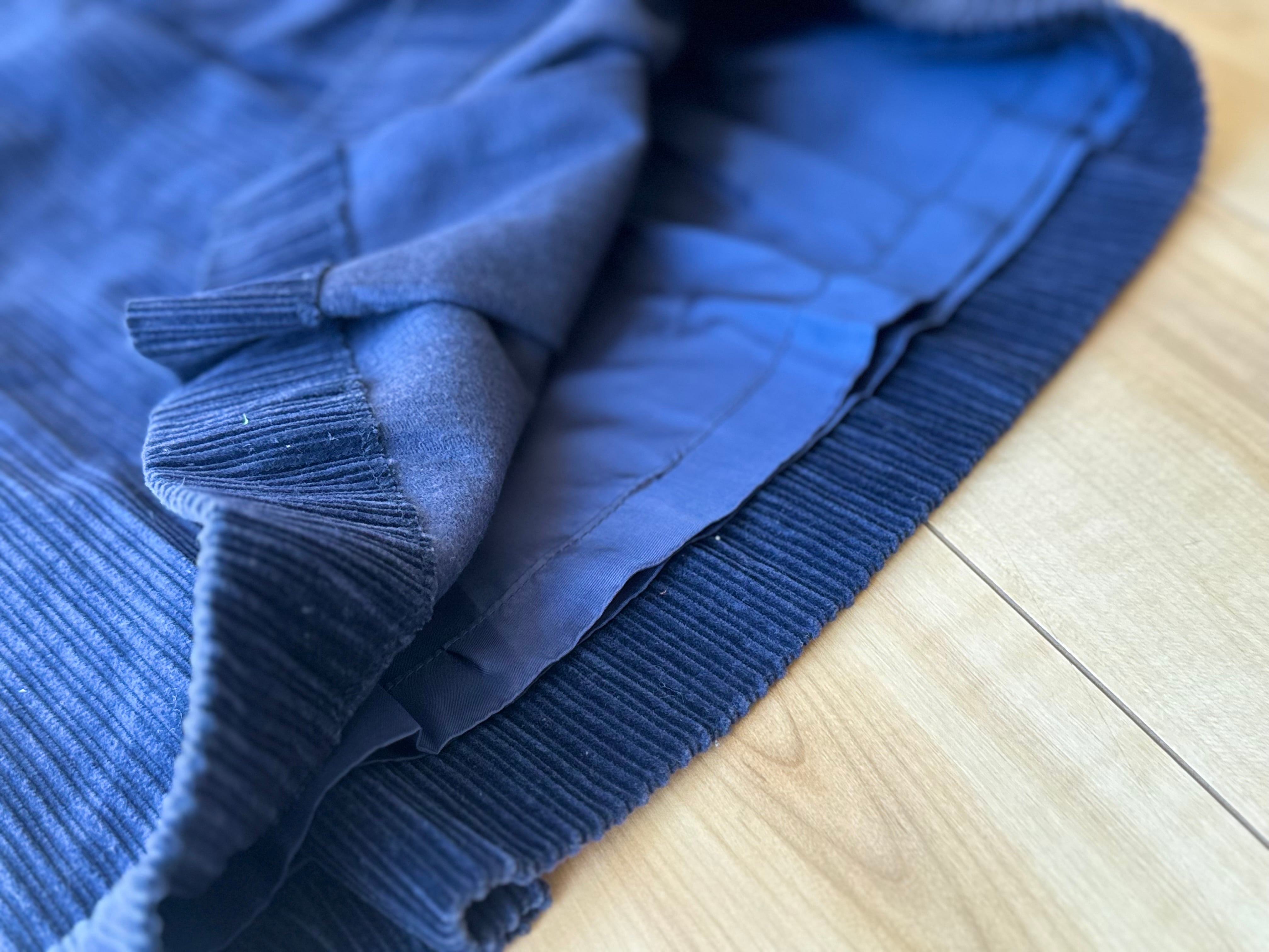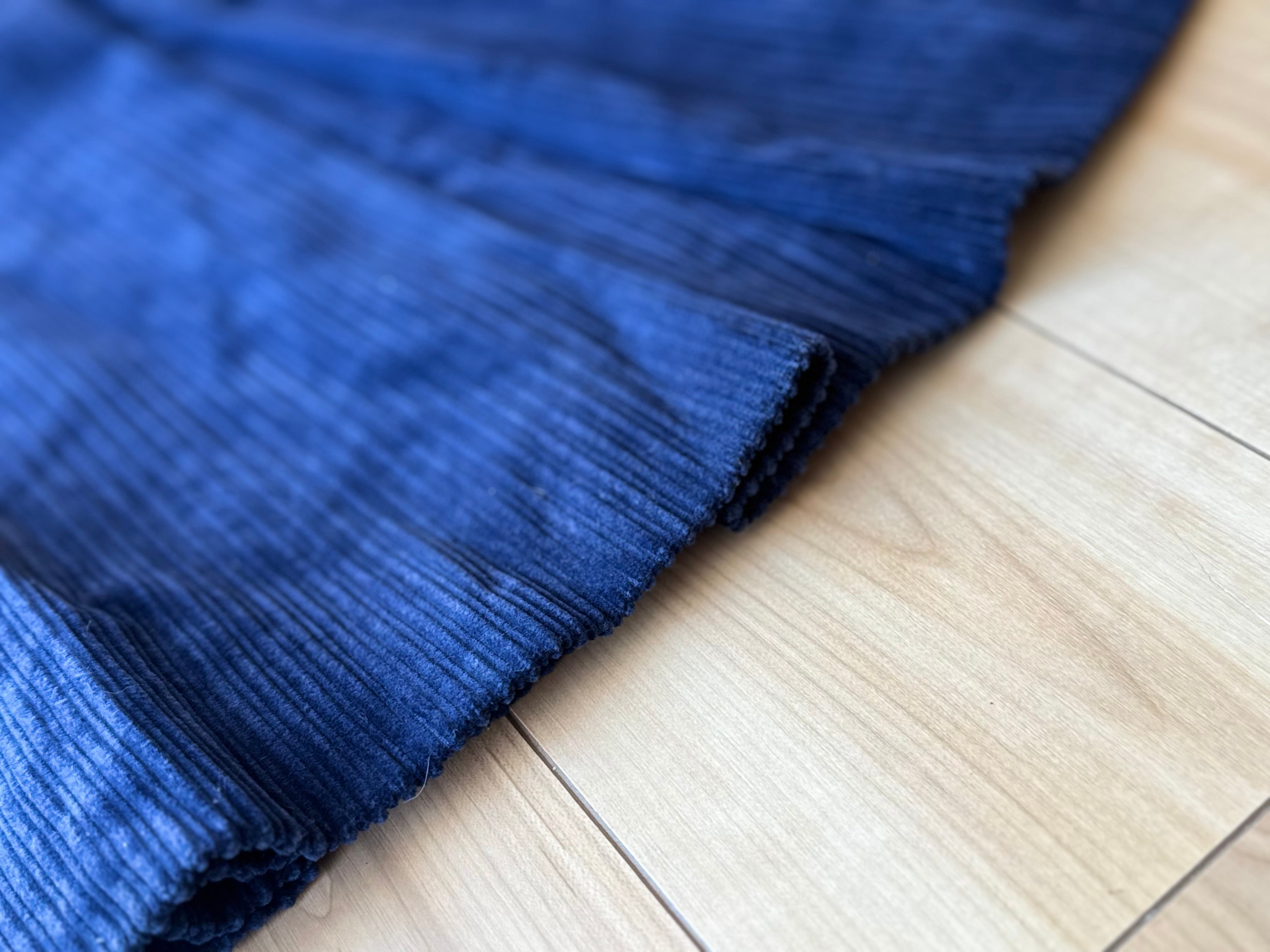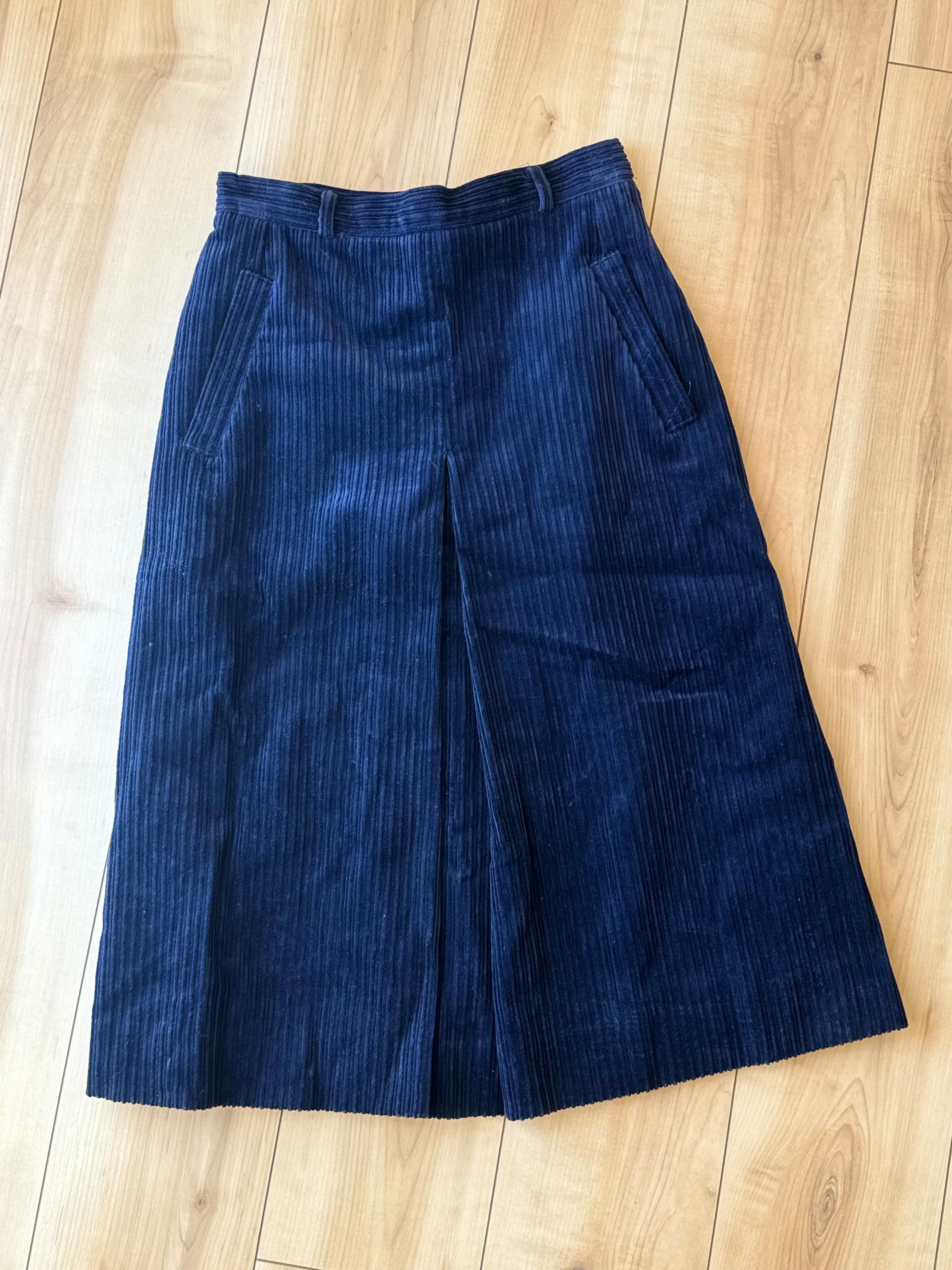 ネイビーのコーデュロイ素材で、フレアデザインのひざ丈スカート。