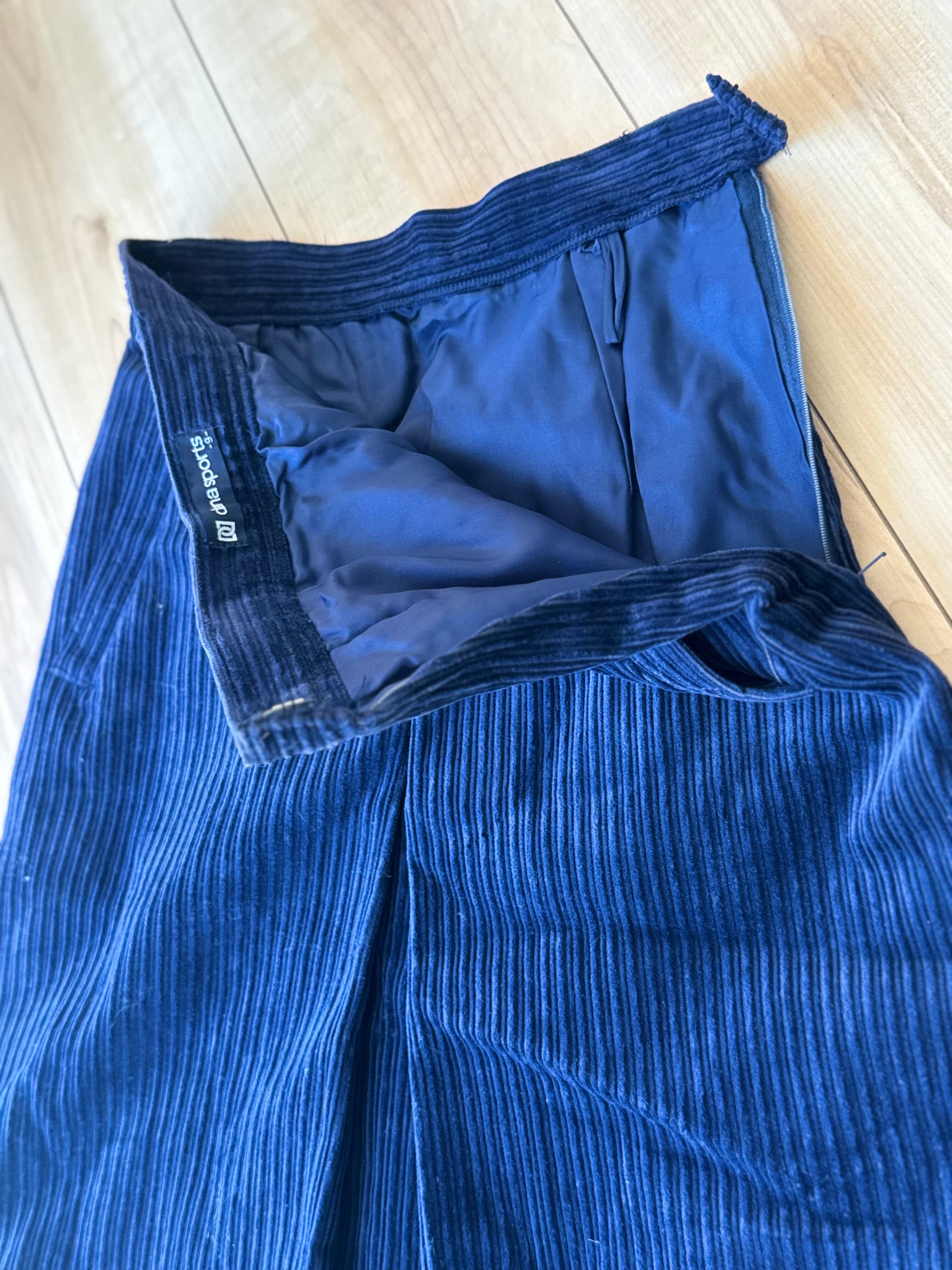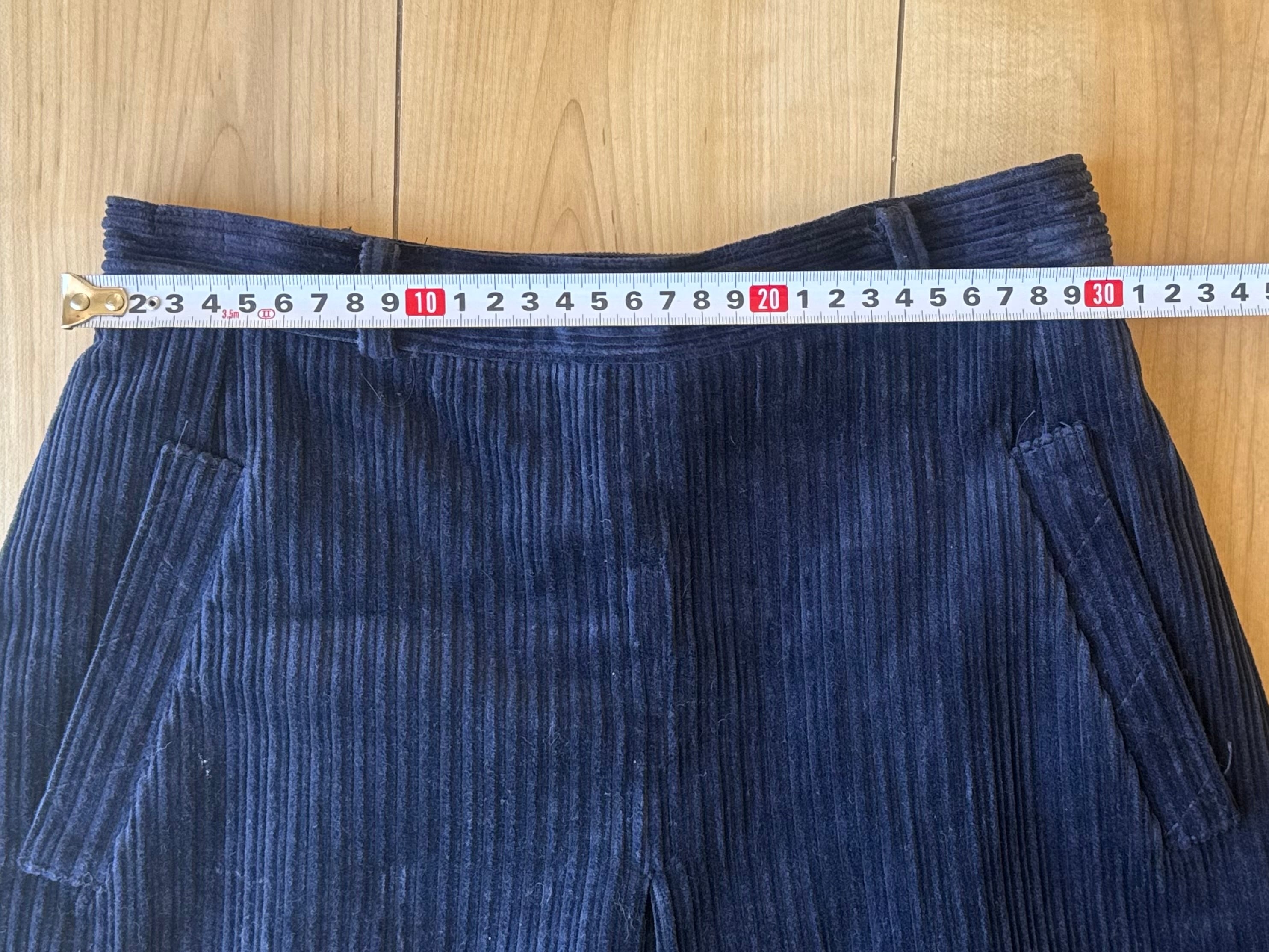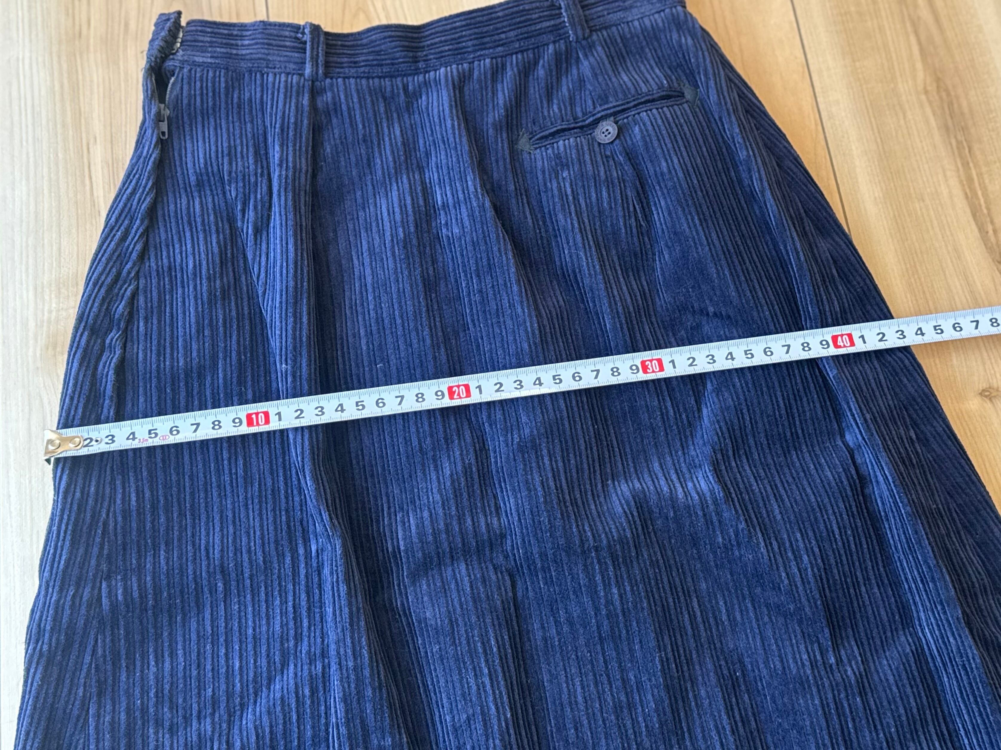 ネイビーのコーデュロイ素材で、フレアデザインのひざ丈スカート。