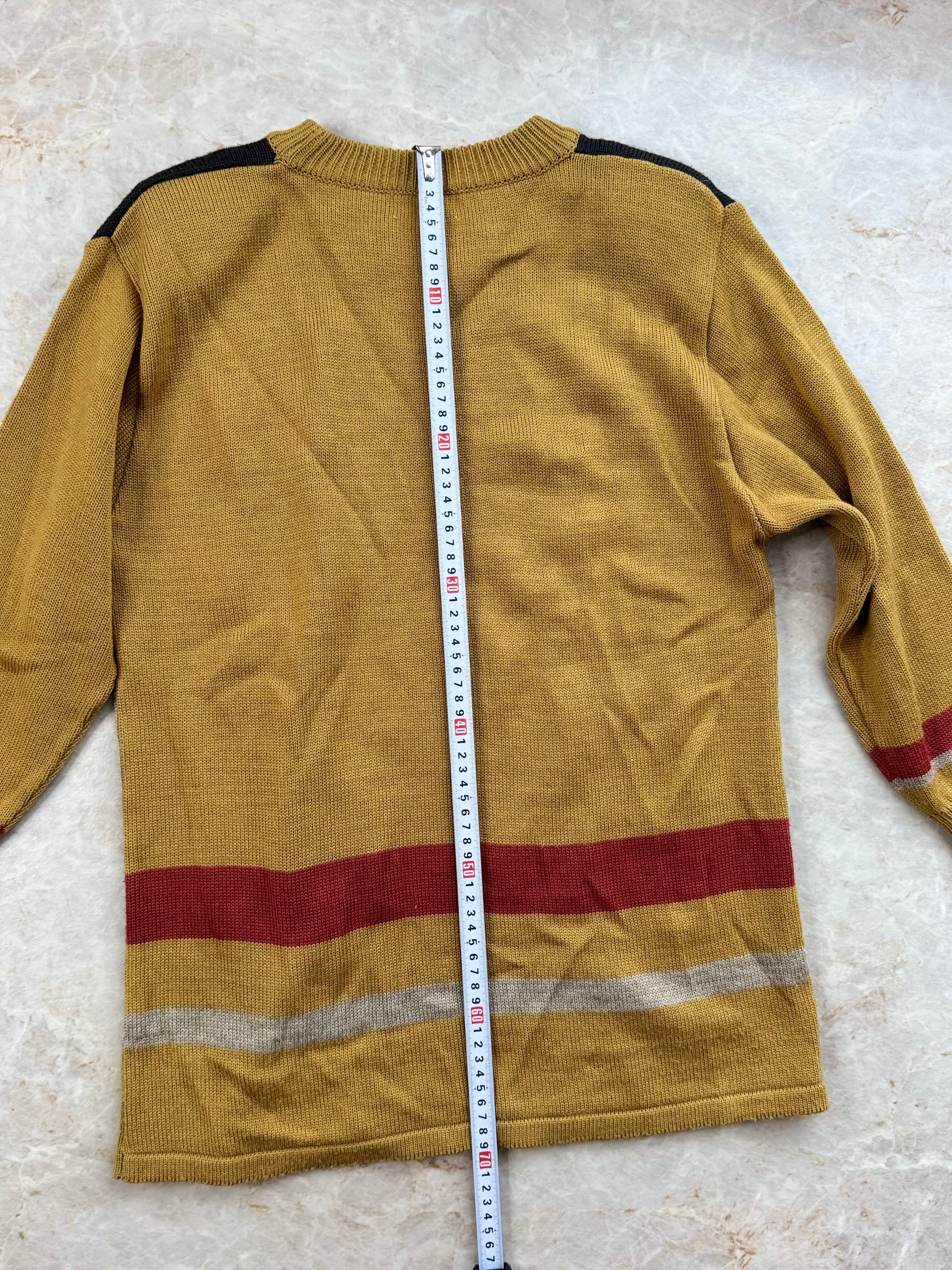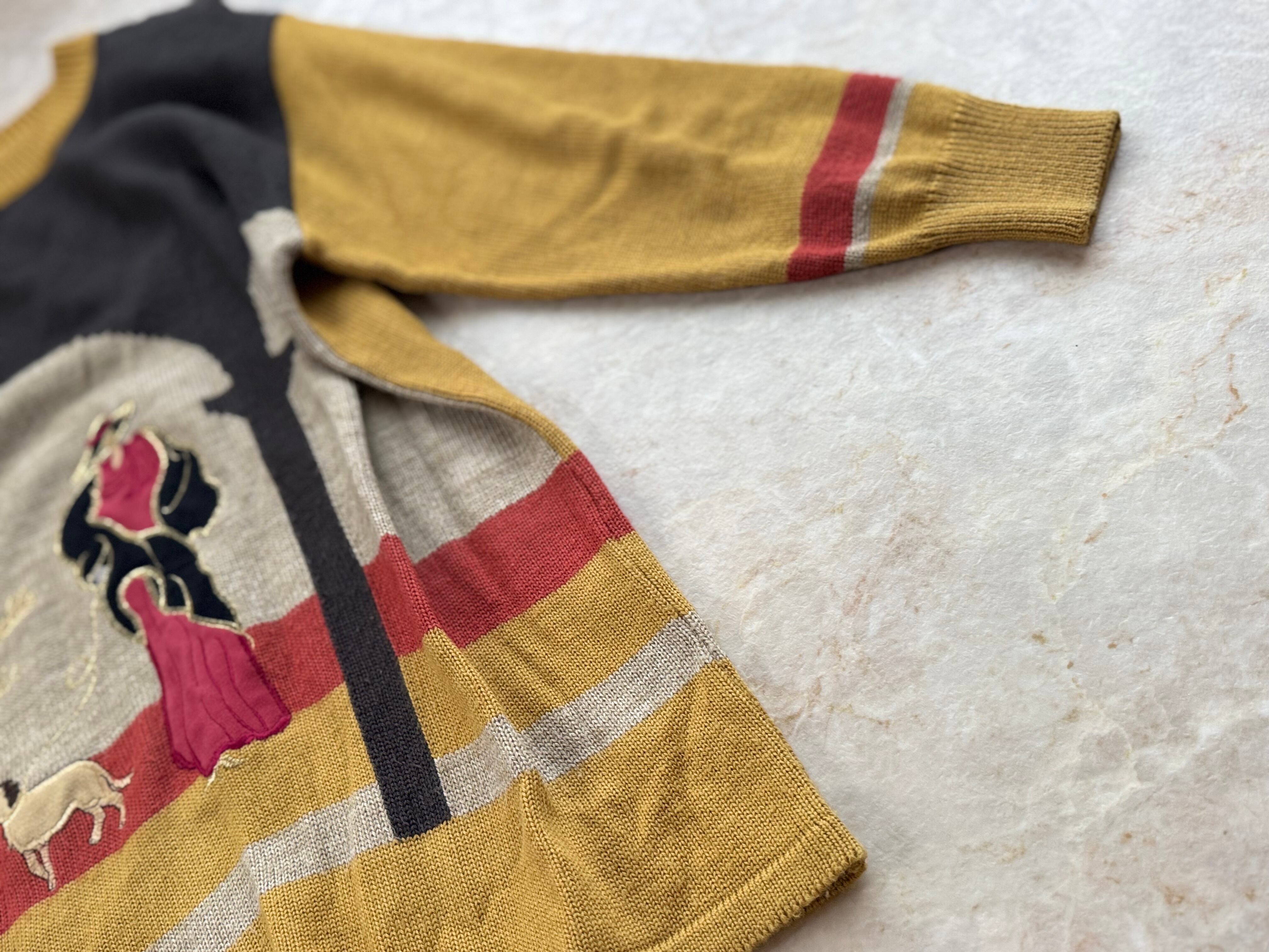 女性と犬の刺繍が施されたマスタードカラーのニットセーター。
