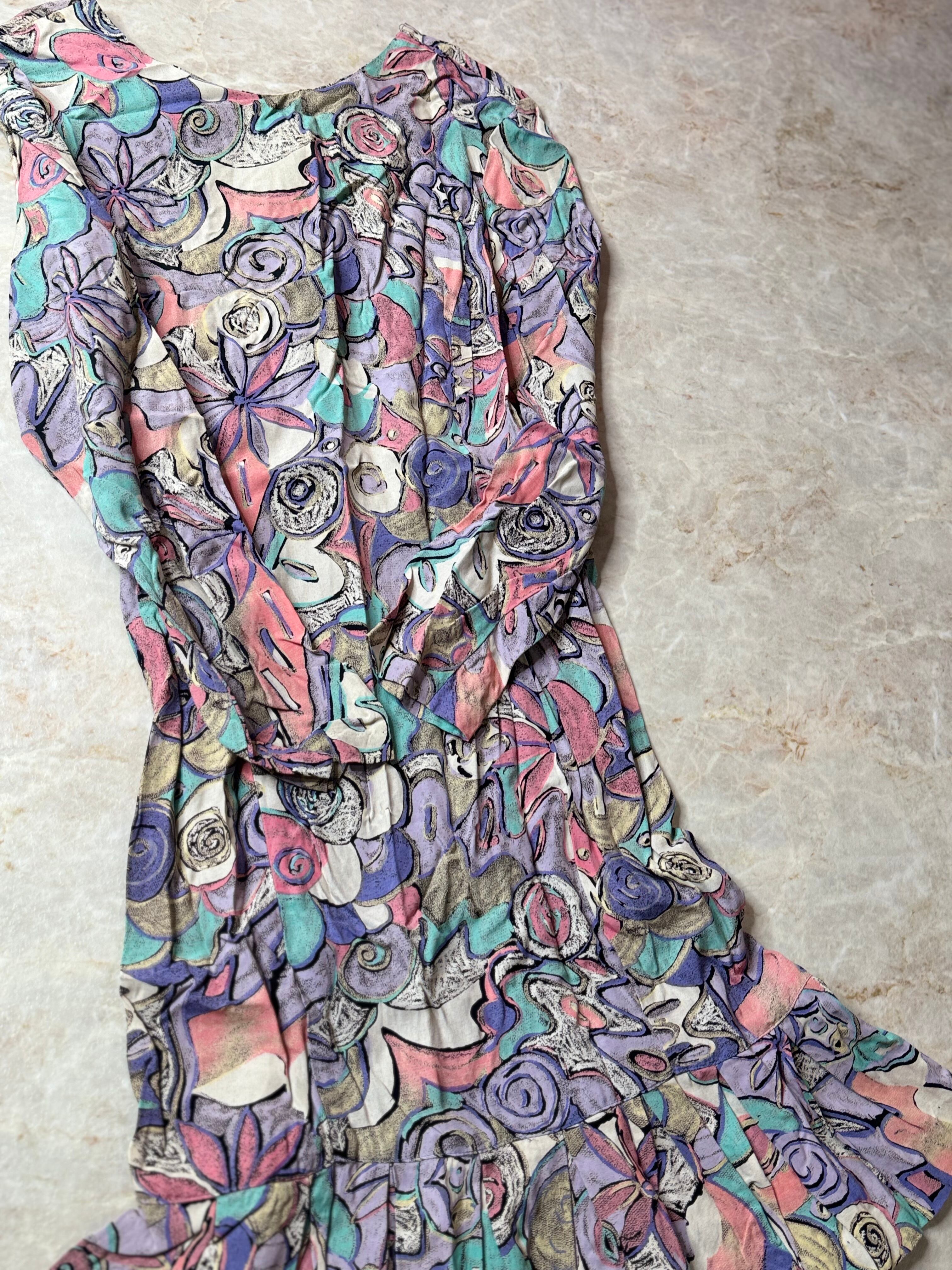 フリル付きの花柄デザインが特徴の多色使いのひざ丈ワンピース