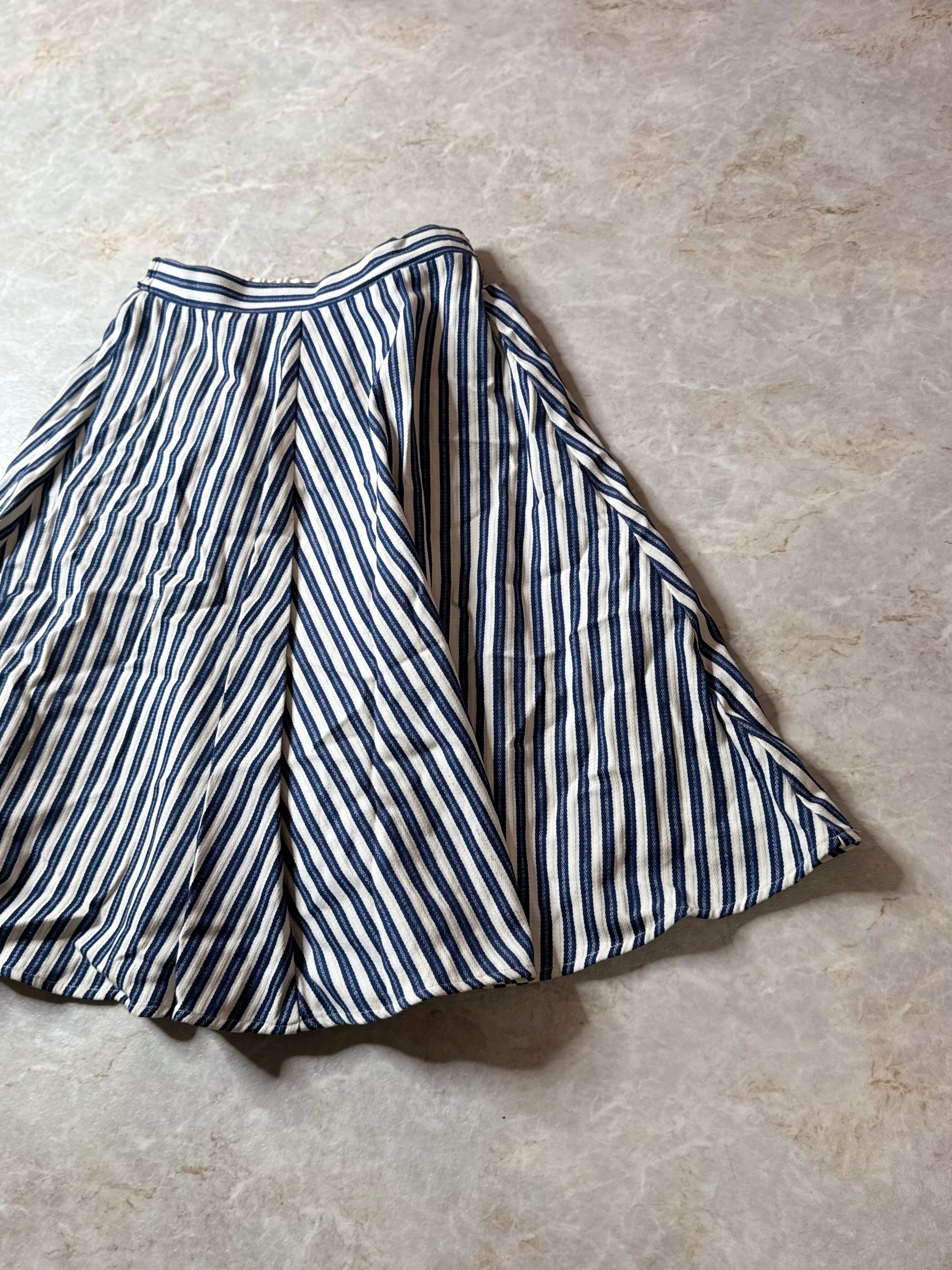 ネイビーとホワイトのストライプデザインのフレアスカート、ひざ丈でコットン混紡素材。