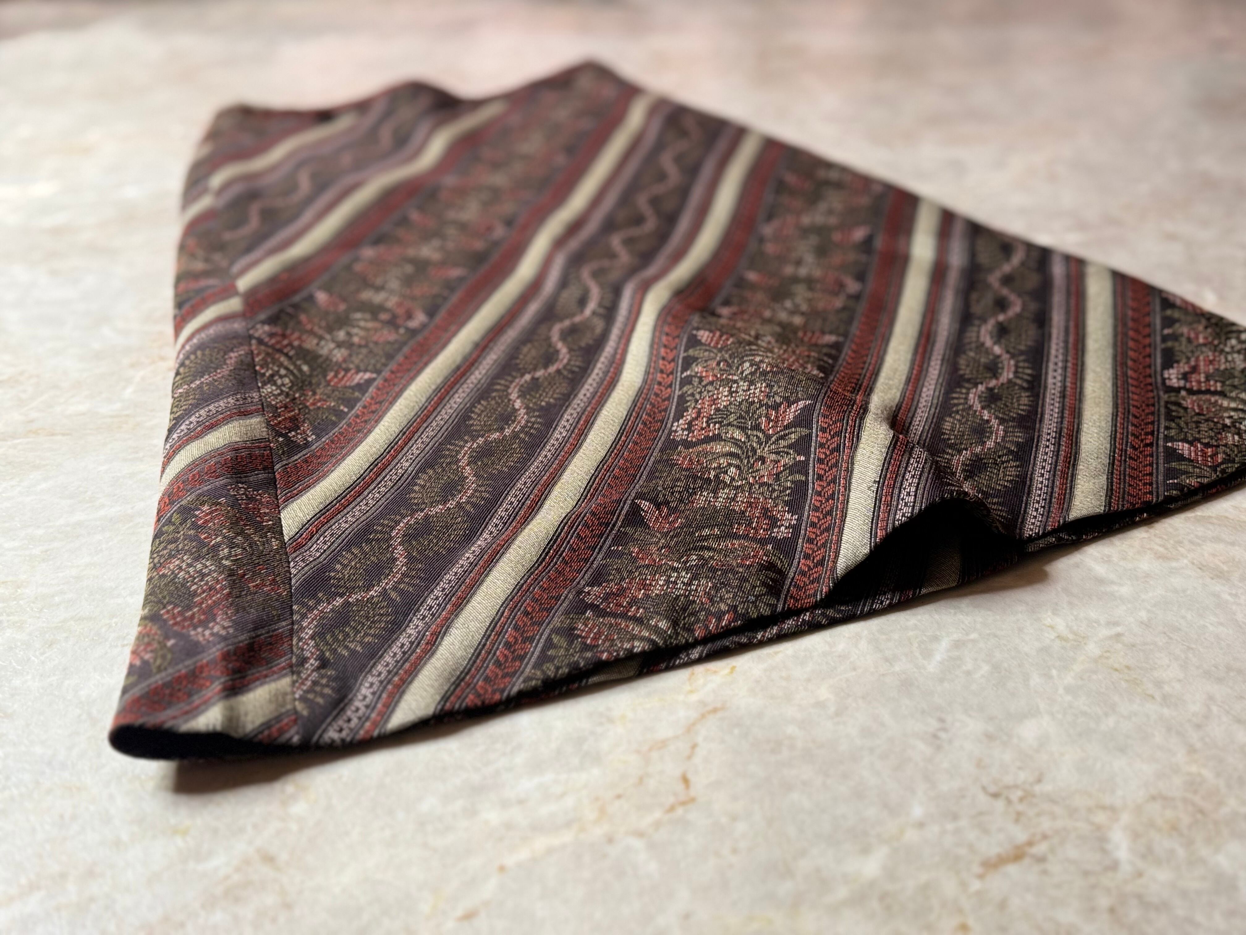 ダークトーンのストライプ柄フレアスカート、ウエストバンド付きでスタイリッシュ。