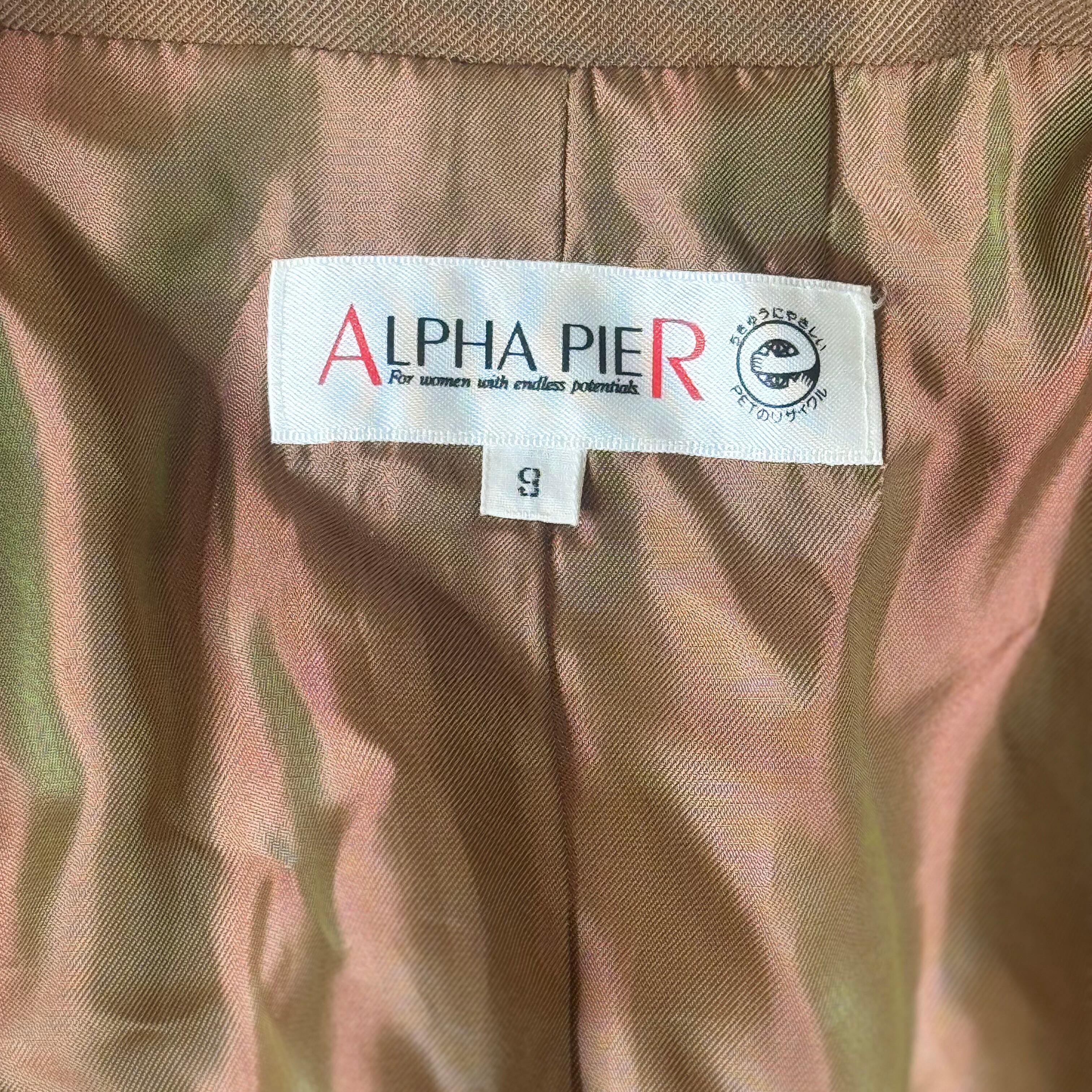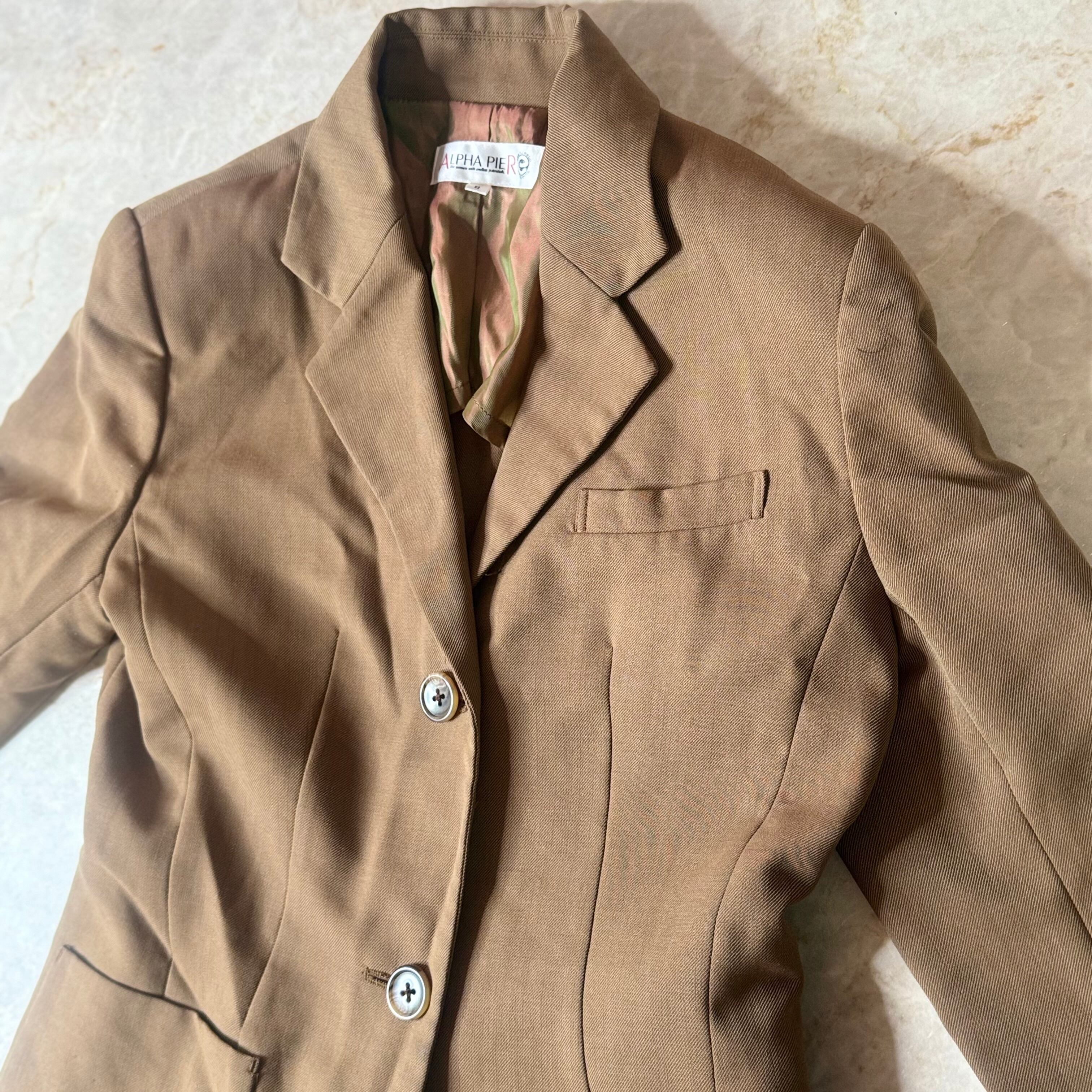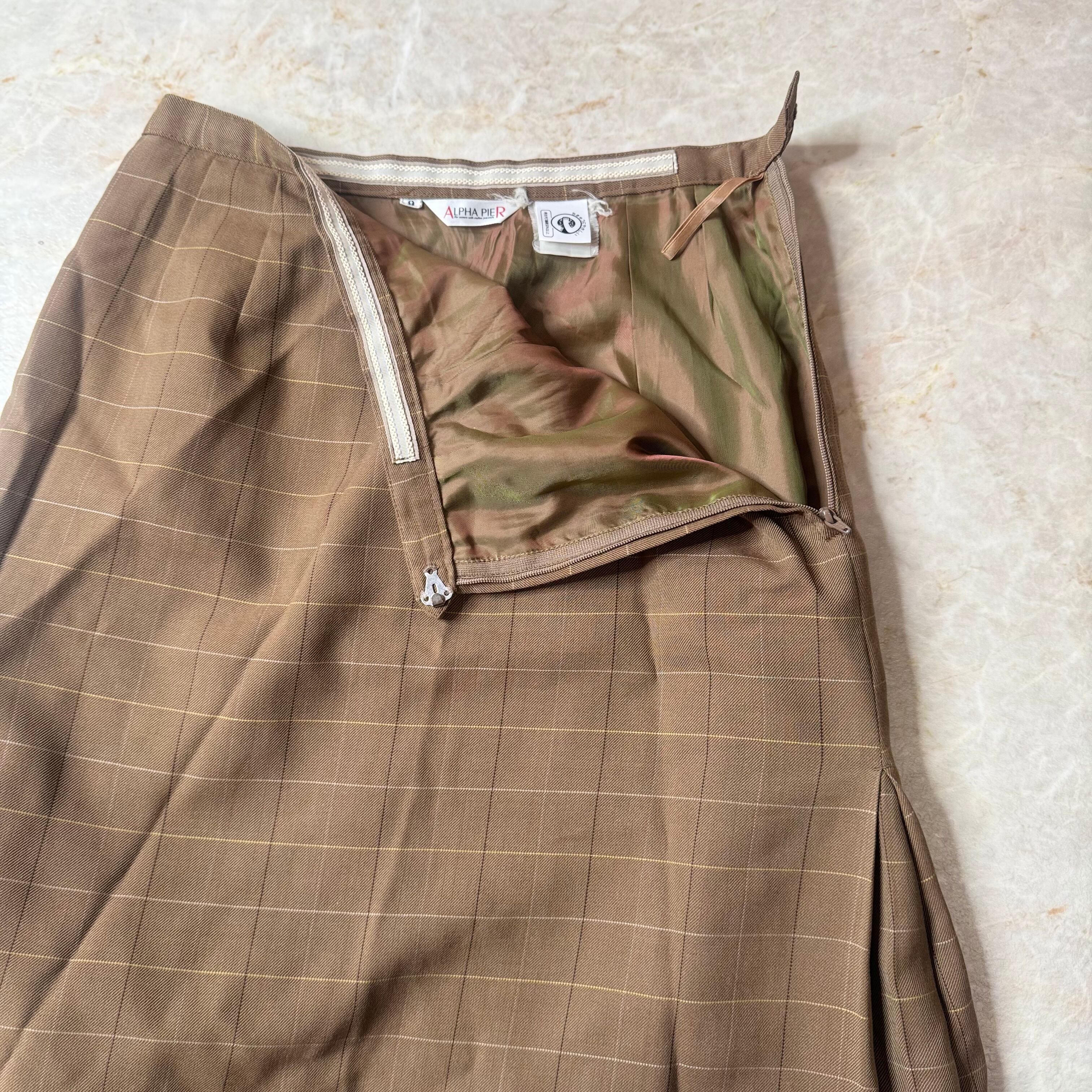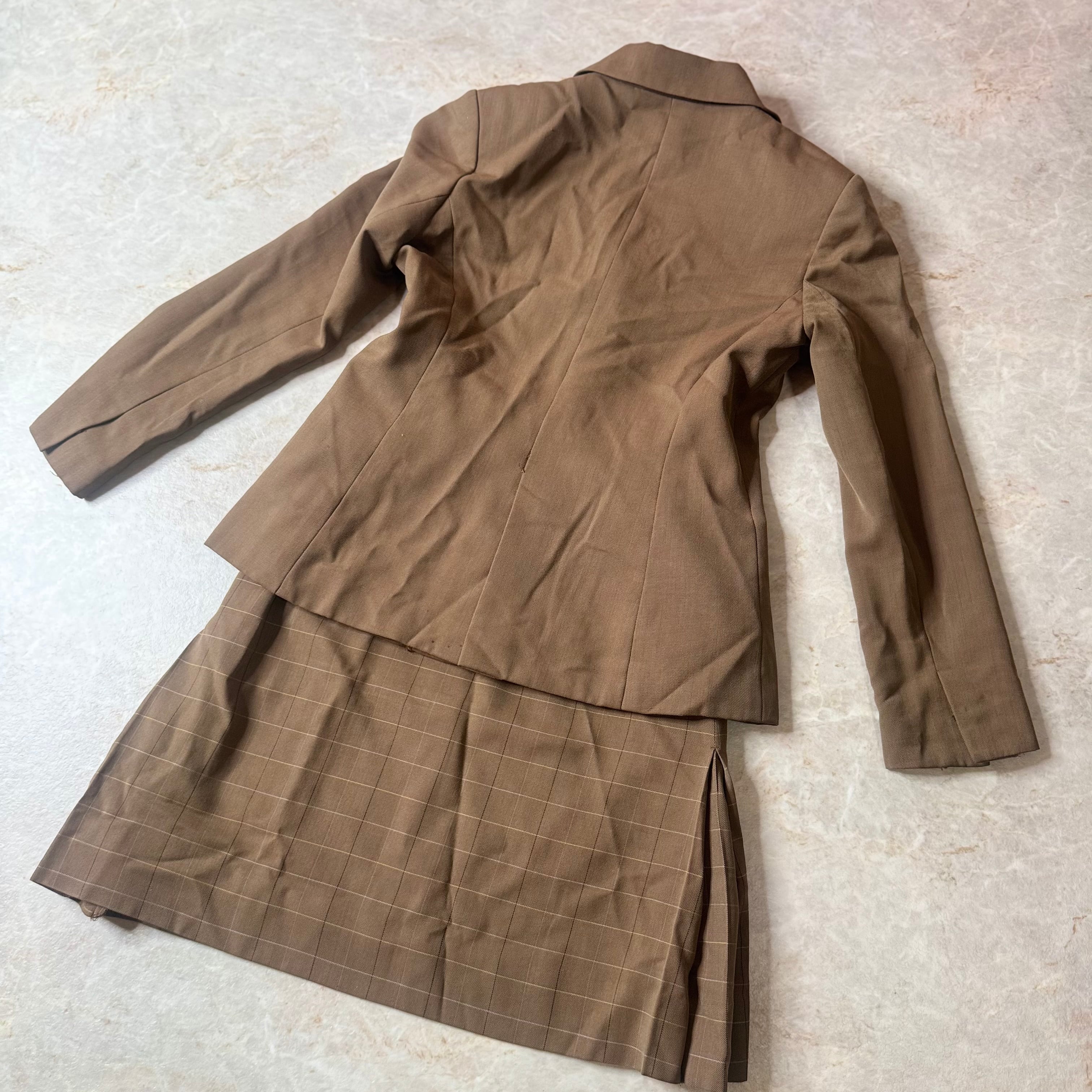 ブラウンのチェック柄スカートセットアップ、ジャケットは2つボタンでポケット付き、スカートはスリット入り。