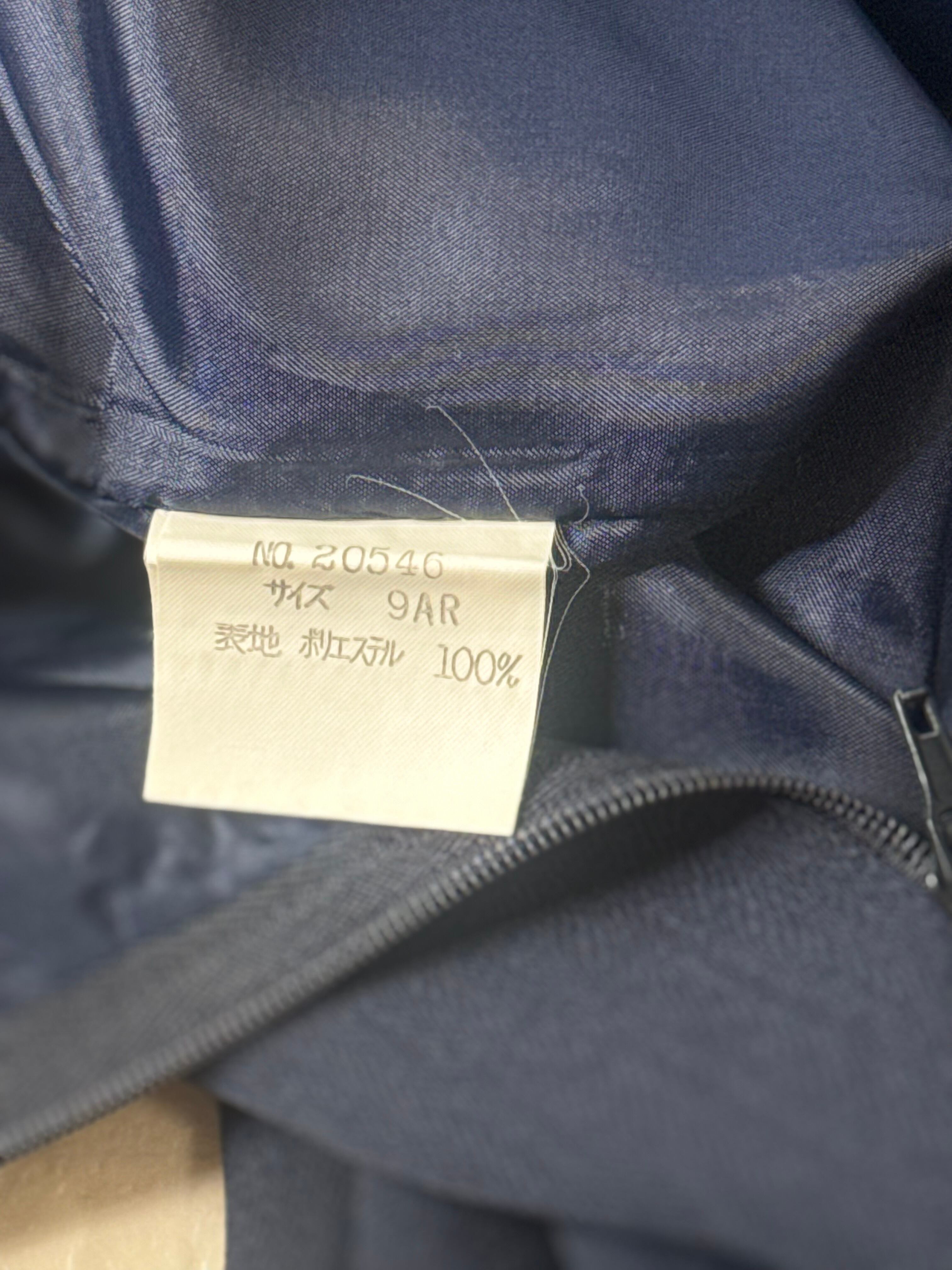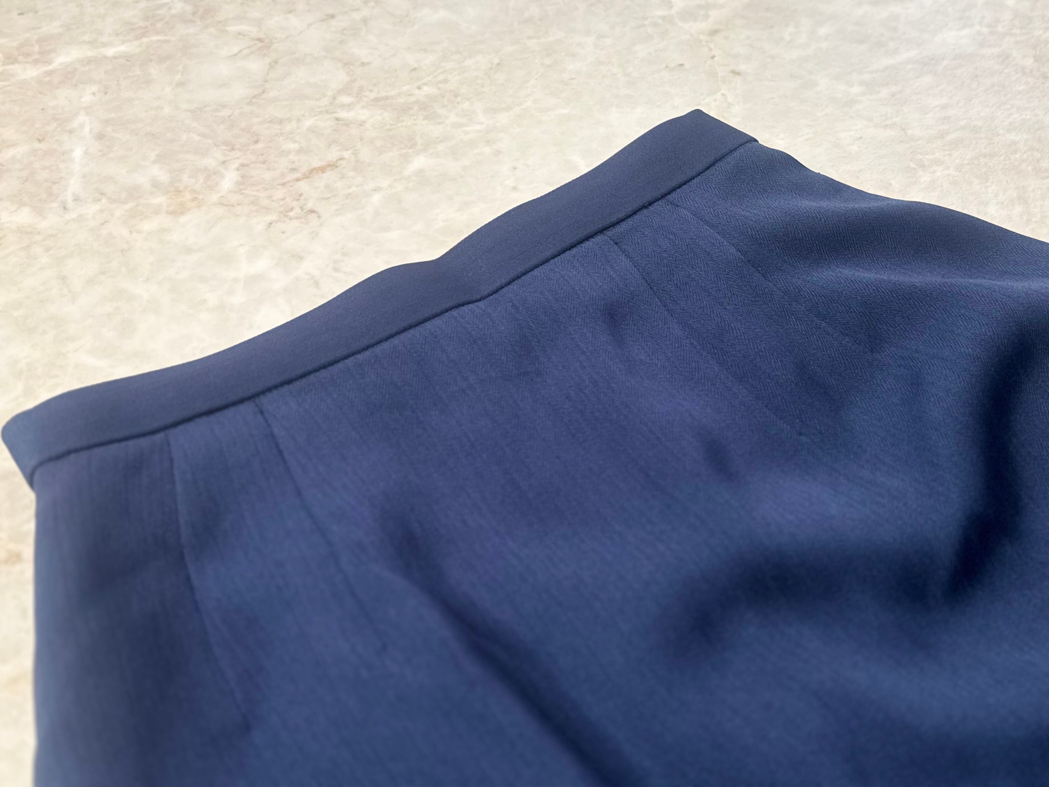 ネイビーのタイトスカート、プリーツデザインでシンプルかつエレガントなスタイル。