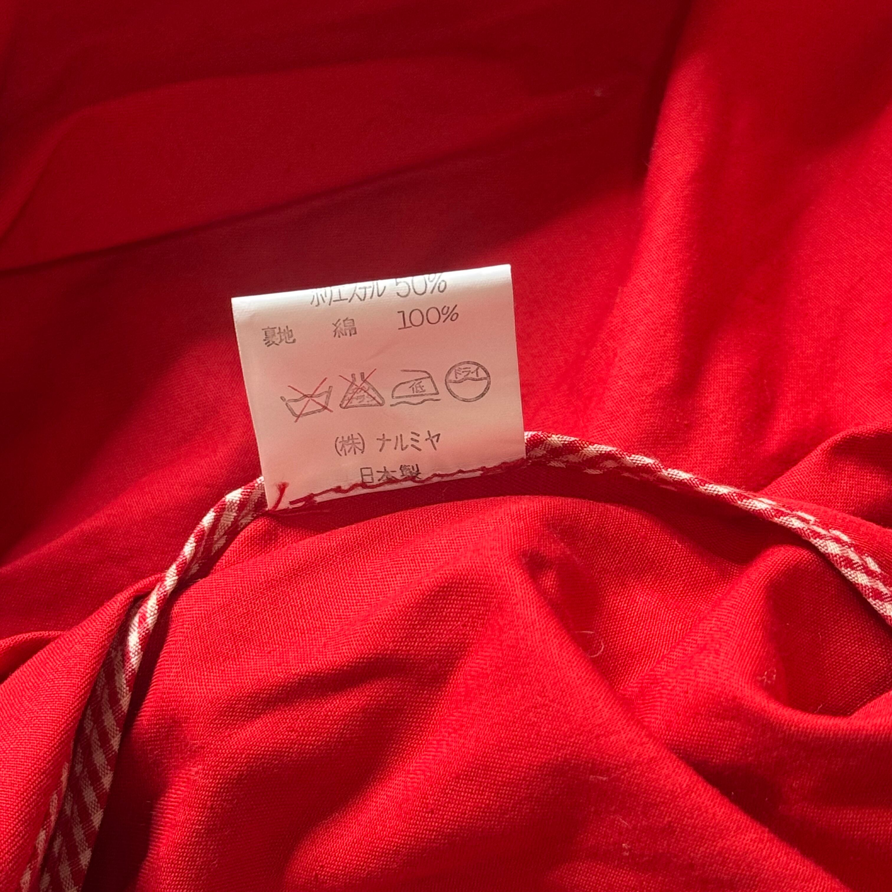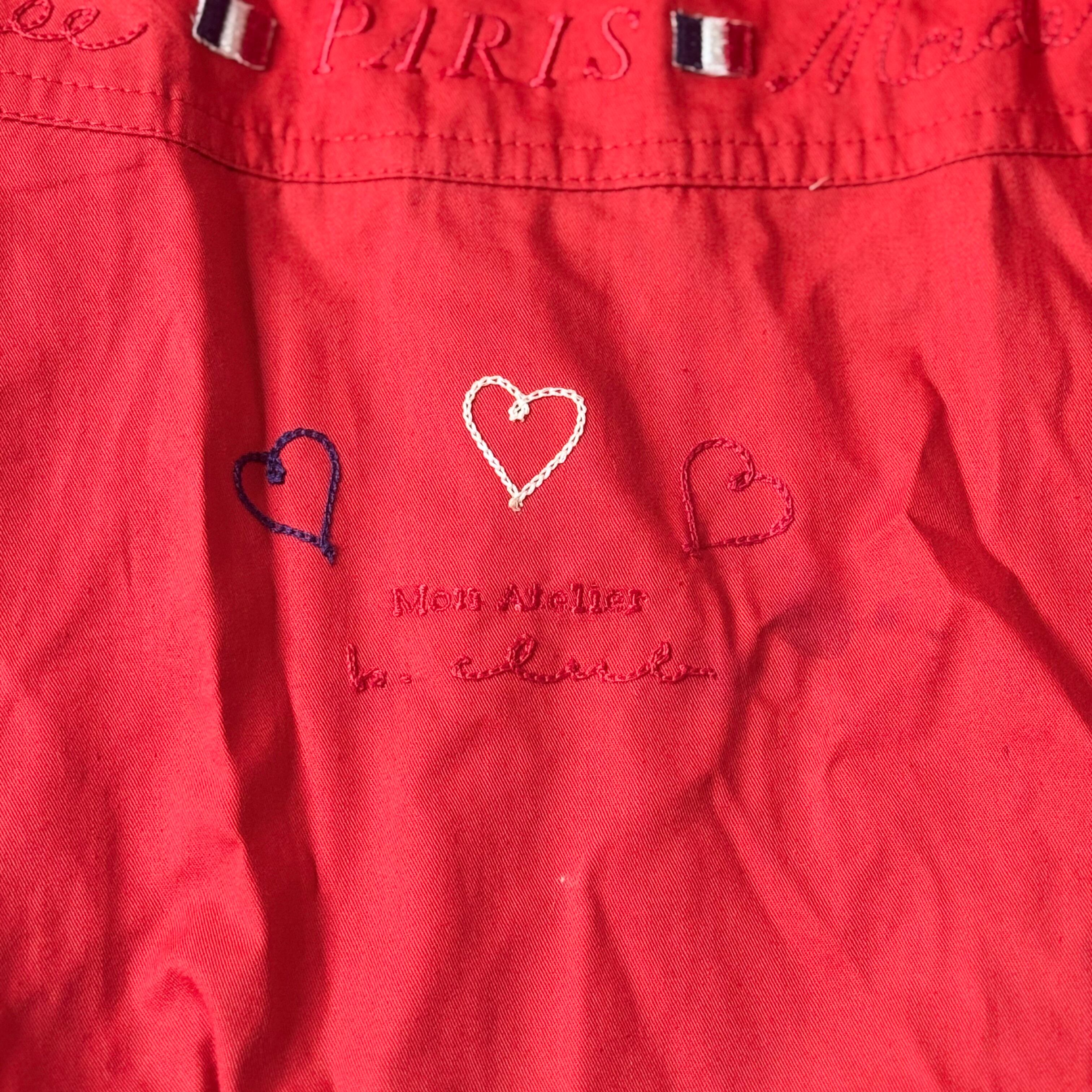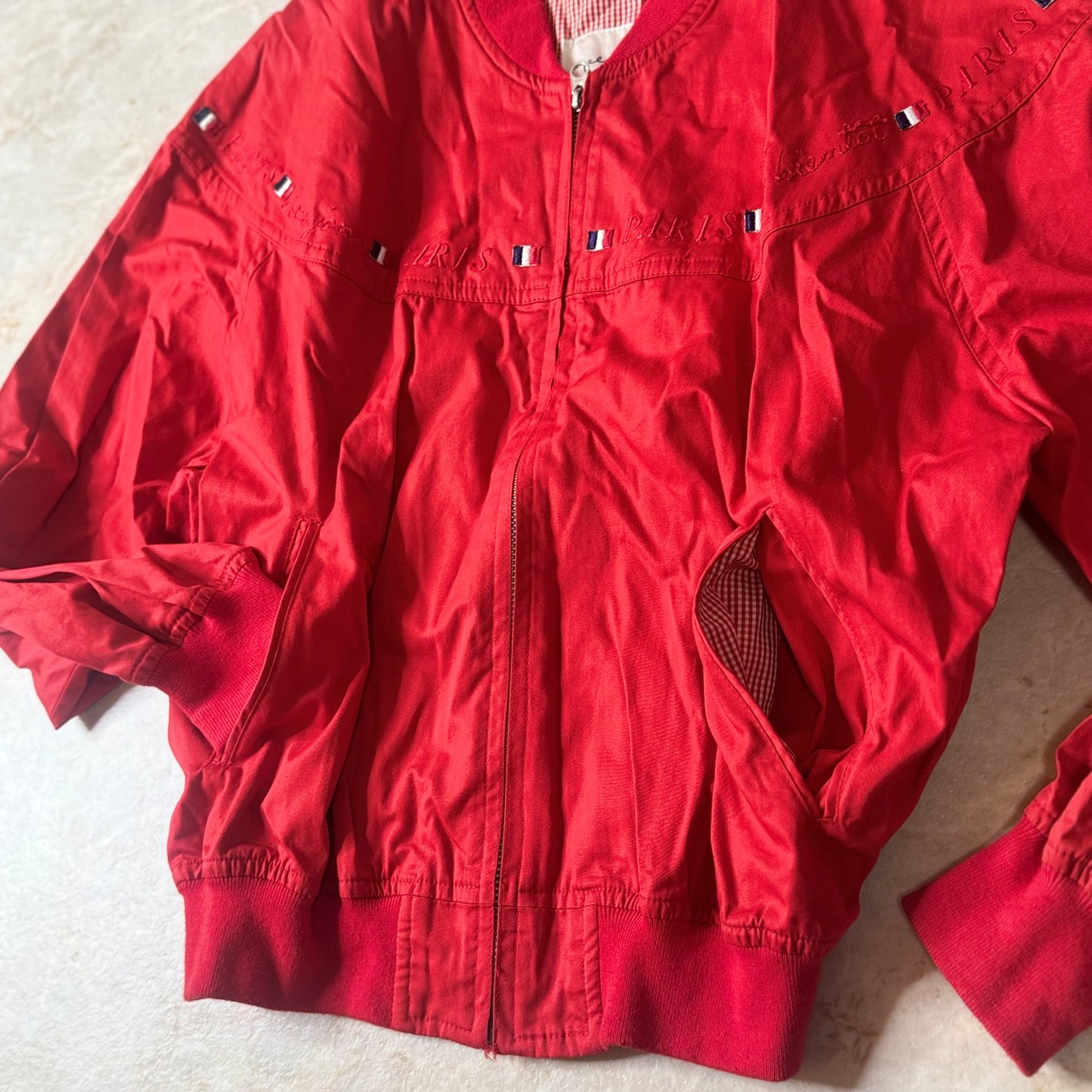フランス国旗のディテールが特徴的な赤いカジュアルジャケット。