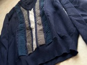 ネイビーのVネックセーター、ストライプデザインでカジュアルに最適。