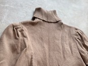ベージュのタートルネックニット、パフスリーブデザインでスタイリッシュ。