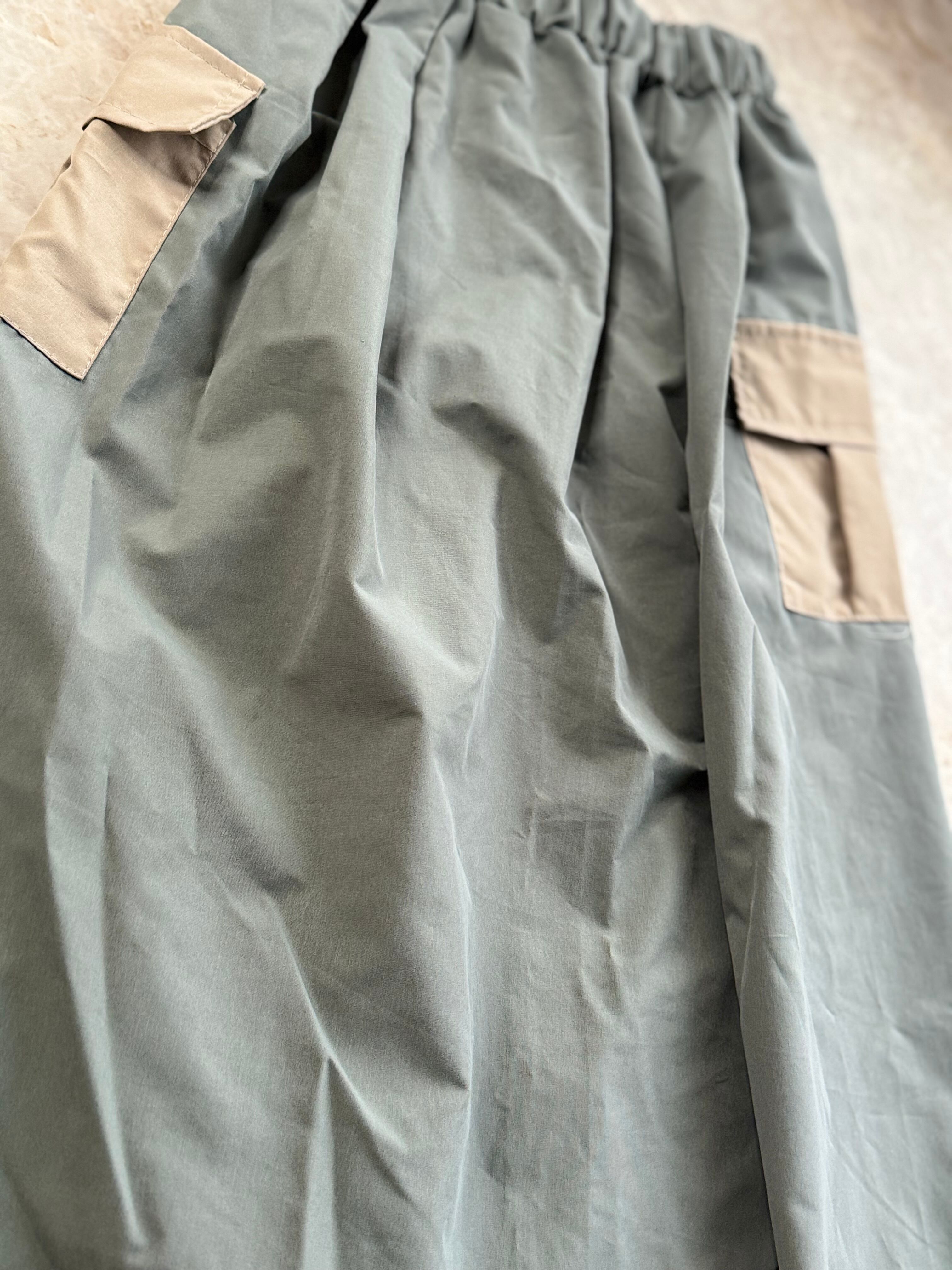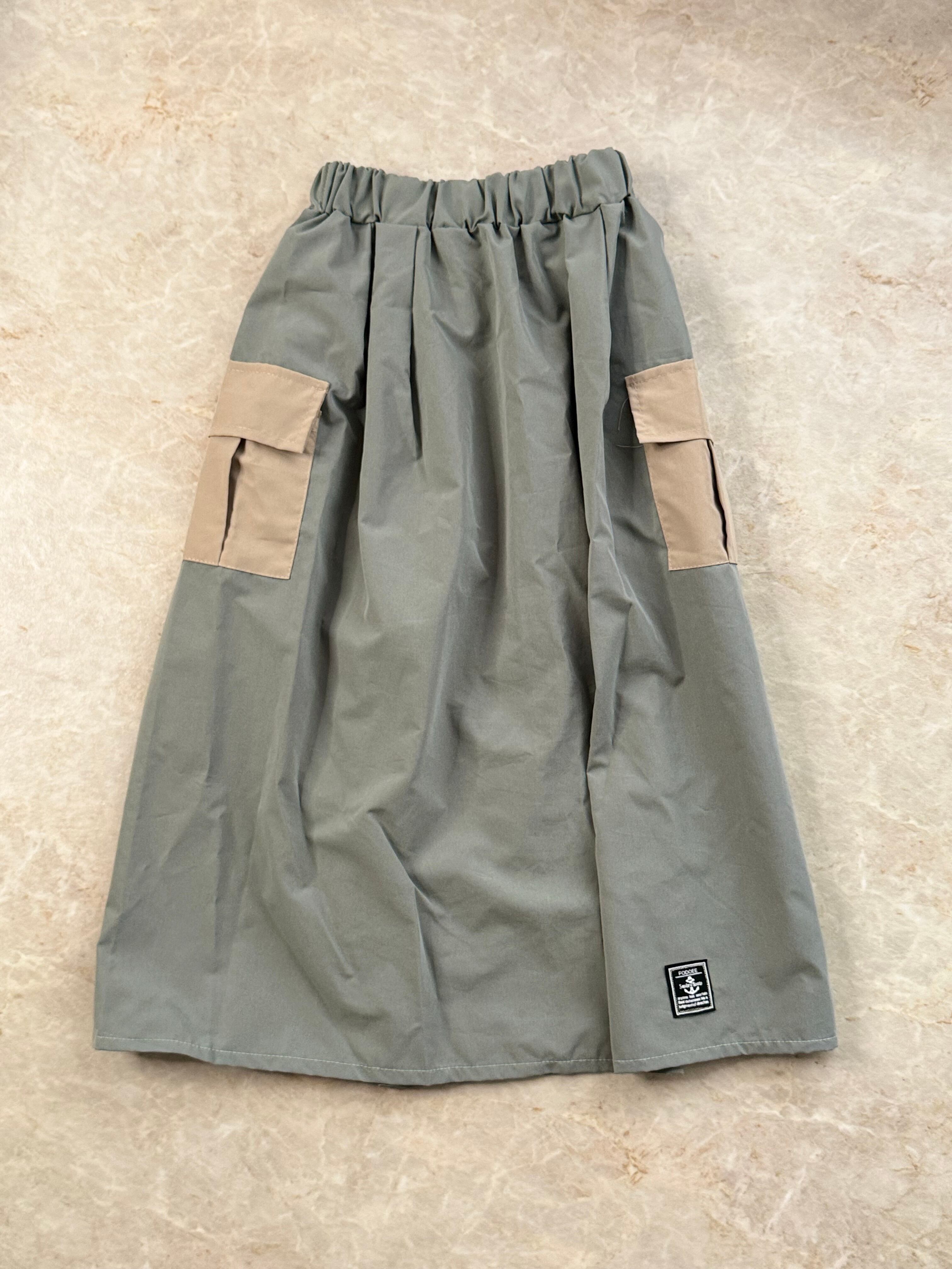 ナイロン素材のグレーのフレアスカート、2つのポケット付き。